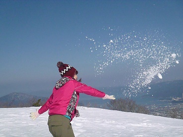 青空のもと、白い雪踏み踏みできて