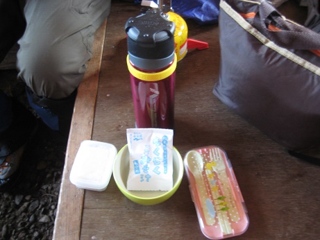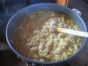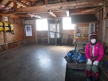 山小屋の中で食べさせてもらおう。